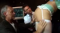 Perwersyjny trójkąt kochanków. Wyuzdana dziwka rucha się na dwa baty. Jednemu robi laskę, drugi rucha ją od tyłu. Potem, ssie ich kutasy z przyjemnością. Na koniec, sperma wypływa z jej ust.